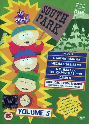 The insanity that is South Park is captured in these five outrageous episodes from Series 1. South Park - where the extraordinary and the unbelievable are just part of everyday life.VOLUME 3STARVIN' MARVIN'It's Thanksgiving! Genetically altered turkeys are on the rampage in South Park, and Cartman is mistaken for a starving Ethiopian.MECHA-STREISANDA monster threatens to destroy South Park, but help is on the way in the form of award-winning actor, a celebrated movie critic and a rock superstar.MR HANKEY THE CHRISTMAS POOChristmas time in South Park finds Kyle incarcerated in the South Park Mental House, but an unlikely hero saves the day.DAMIENWhen the son of the prince of darkness arrives in South Park, Cartman's birthday party is upstaged by the battle of good against evil.CARTMAN'S MOM IS A DIRTY SLUTStan, Kyle and Kenny seek advice from Mr. Garrison, while Cartman sets out to uncover the identity of his real father.