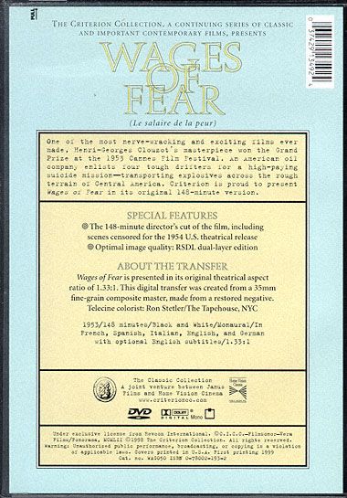 One of the most nerve-wracking and exciting films ever made, Henri-Georges Clouzot's masterpiece won the Grand Prize at the 1953 Cannes Film Festival. An American oil company enlists four tough drifters for a high-paying suicide mission—transporting explosives across the rough terrain of Central America. Criterion is proud to present Wages of Fear in its original 148-minute version.