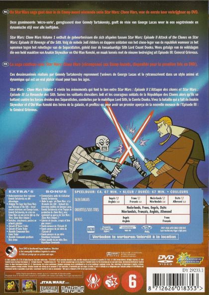 De Star Wars saga gaat door in de Emmy-award winnende serie Star Wars: Clone Wars, voor de eerste keer verkrijgbaar op DVD.Deze geanimeerde 'micro-serie', geregiseerd door Genndy Tartakovsky, geeft de visie van George Lucas weer in een oogstrelende en dynamische stijl voor alle leeftijden.Star Wars: Clone Wars Volume 1 onthult de gebeurtenissen die zich afspelen tussen Star Wars: Episode II Attack of the Clones en Star Wars: Episode III Revenge of the Sith. Volg de nobele Jedi ridders en dappere soldaten van het clone-leger van de republiek wanneer ze het opnemen tegen het robotleger van de Separatisten, geleid door de kwaadaardige Sith Lord Count Dooku. Wees getuige van de veldslagen die een held maakten van Anakin Skywalker en Obi-Wan Kenobi, en maak kennis met de nieuwe bedreiging uit Episode III: General Grievous.La saga continue avec Star Wars: Clone Wars (récompensé aux Emmy Awards, disponible pour la première fois en DVD).Ces dessinsanimés réalisés par Genndy Tartakovsky reprennent l'univers de George Lucas et le retranscrivent dans un style animé et dynamique qui est un vrai plaisir visuel pour tous les âges.Star Wars: Clone Wars Volume 1 révèles les évènements qui font le lien entre Star Wars : Episode II L'Attaque des clones et Star Wars : Episode III La Revanche des Sith. Suivez les vaillants chevaliers Jedi et les courageux soldats de la République des Clones alors qu'ils se battent contre les forces droïdes des Séparatistes, conduites par le maléfique Lord Sith, le Comte Dooku. Vivez la bataille qui a fait de Anakin Skywalker et d'Obi Wan Kenobi des héros de la galaxie, et profitez-en pour avoir un premier aperçu de la nouvelle menace de l'Episode III : le Général Grievous.