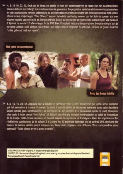 4, 8, 15, 16, 23, 42. Druk op de knop, en bereid je voor om ondersteboven te raken van het baanbrekende drama dat een wereldwijd televisiefenomeen is geworden. De populaire serie bereikt nieuwe hoogtepunten in het spectaculaire tweede seizoen als de overlevenden van Oceanic Flight 815 ontdekken dat ze niet alleen staan in hun strijd tegen "The Others", en een betwiste beslissing nemen om het luik te openen dat een nieuwe wereld van mysterie en intrige onthult. Beleef de mysteries en spannende onthullingen van seizoen 2 tijdens de eerste 12 afleveringen in de DVD Box. Compleet met urenlang origineel bonusmateriaal dat je nergens anders kunt vinden, waaronder niet-uitgezonden originele flashbacks. Ontdek al gauw waarom "alles gebeurd met een reden".Episodes:1. Man of Science, Man of Faith2. Adrift3. Orientation4. Everybody Hates Hugo5. ... And Found6. Abandoned7. The Other 48 Days8. Collision9. What Kate Did10. The 23rd Psalm11. The Hunting Party12. Fire + WaterBonus - Lost Data Found:De Flasbacks van LostLost op locatieFlashbacks en MythologieDeleted ScenesFoto's van de set