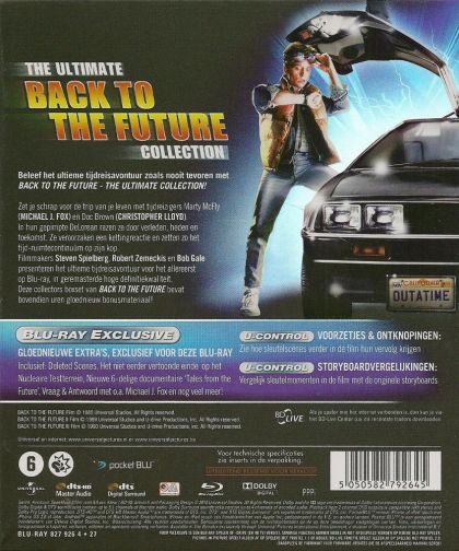 Beleef het ultieme tijdreisavontuur zoals nooit tevoren met BACK TO THE FUTURE - THE ULTIMATE COLLECTION!Zet je schrap voor de trip van je leven met tijdreizigers Marty McFly (MICHAEL J. FOX) en Doc Brown (CHRISTOPHER LLOYD). In hun gepimpte DeLorean razen ze door verleden, heden en toekomst. Ze veroorzaken een kettingreactie en zetten zo het tijd-ruimtecontinuüm op zijn kop.Filmmakers Steven Spielberg, Robert Zemeckis en Bob Gale presenteren het ultieme tijdreisavontuur voor het allereerst op Blu-ray, in geremasterde hoge definitiekwaliteit. Deze collectors boxset van BACK TO THE FUTURE bevat bovendien uren gloednieuw bonusmateriaal!