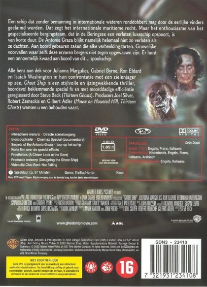 Een schip dat zonder bemanning in internationale wateren ronddobbert mag door de eerlijke vinders geclaimd worden. Dat zegt het internationale maritieme recht. Maar het enthousiasme van het gespecialiseerde bergingsteam, dat in de Beringzee een verlaten luxeschip opspoort, is van korte duur. De Antonia Graza blijkt namelijk helemaal niet zo verlaten als ze dachten. Aan boord gebeuren zaken die elke verbeelding tarten. Gruwelijke voorvallen waar zelfs deze ervaren bergers niet tegen opgewassen zijn. Er huist een onnoemelijk kwaad aan boord van dit… spookschip. Alle hens aan dek voor Julianna Margulies, Gabriel Byrne, Ron Eldard en Isaiah Washington in hun confrontatie met een zielenjager op zee. Ghost Ship is een stijlvolle en ijzingwekkende thriller, boordevol beklemmende special fx en met moorddadige efficiëntie geregisseerd door Steve Beck (Thirteen Ghosts). Producers Joel Silver, Robert Zemeckis en Gilbert Adler (House on Haunted Hill, Thirteen Ghosts) wensen u een behouden vaart.