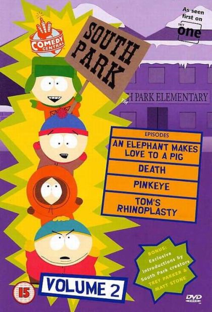 The insanity that is South Park is captured in these four outrageous episodes from Series 1. South Park - where the extraordinary and the unbelievable are just part of everyday life.VOLUME 2AN ELEPHANT MAKES LOVE TO A PIGThe boys attempt to breed an elephant with a potbellied pig and the town's geneticist creates an evil clone from Stan's DNA. DEATHWhile their parents are out of town protesting against the kids' favorite TV show, Terrance and Phillip, Death pays a visit to South Park.PINKEYEOn Halloween, a mishap at the morgue transforms the residents of South Park into brain-eating zombies, interfering with the school's costume contest and the boys' trick or treating.TOM'S RHINOPLASTYMr. Garrison deserts his class for a visit to Tom's Rhinoplasty, and Wendy is afraid that substitute teacher Ms. Ellen has her eye on Stan.