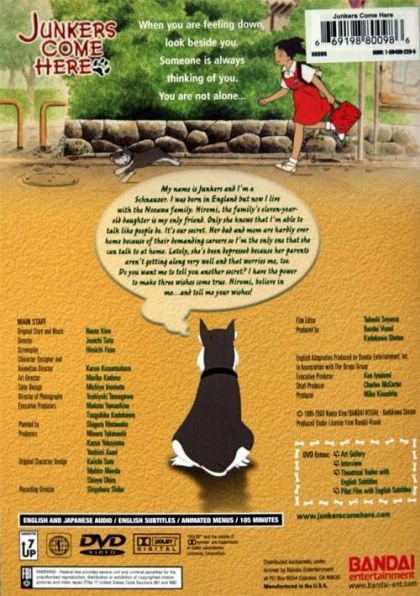 When you are feeling down,look beside you.Someone is alwaysthinking of you.You are not alone...My name is Junkers and I'm a Schnauzer. I was born in England but now I live with the Nozawa family. Hiromi, the family's eleven-year-old daughter is my only friend. Only she knows that I'm able to talk like people do. It's our secret. Her dad and mom are hardly ever home because of their demanding careers so I'm the only one that she can talk to at home. Lately, she's been depressed because her parents aren't getting along very well and that worries me, too. Do you want me to tell you another secret? I have the power to make three wishes come true. Hiromi, believe in me... and tell me your wishes!