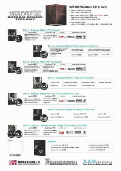 - Infernal Affairs "The Movie"- Infernal Affairs Trilogy Special Features- Infernal Affairs II "The Movie"- Infernal Affairs II "Special Features"- Infernal Affairs III "The Movie"(Director's Cut)- Infernal Affairs III "Special Features"- Infernal Affairs Trilogy