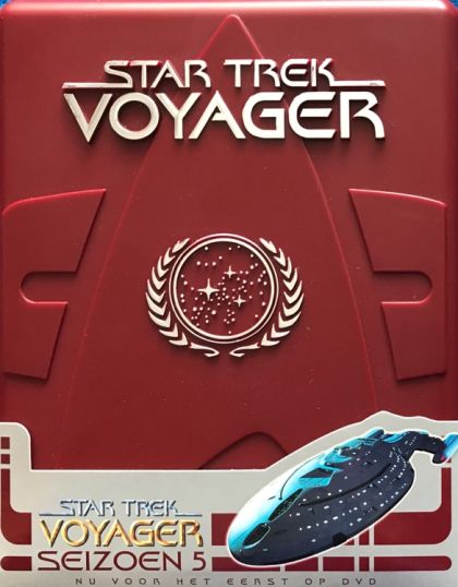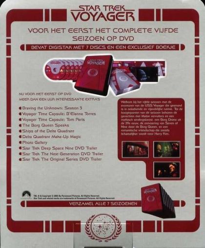 Voor het eerst het complete vijfde seizoen op DVDWelkom bij het vijfde seizoen met de avonturen van de USS Voyager die gestrand is in onbekende en vijandelijke ruimte. Tot de hoogtepunten van dit seizoen behoren de gevechten met Malon vervuilers en een mythisch stralingsbeest. Een Borg Drone uit de 29e eeuw, de ontvoering van Seven of Nine door de Borg Queen, en een romantische vriendschap die steeds lichamelijker wordt voor Harry Kim. Disc 1:1. Night 2. Drone 3. Extreme Risk 4. In the Flesh Disc 2:5. Once Upon A Time 6. Timeless 7. Infinite Regress 8. Nothing Human Disc 3:9. Thirty Days 10. Counterpoint 11. Latent Image 12. Bride of Chaotica Disc 4:13. Gravity 14. Bliss 15. Dark FrontierDisc 5:16. The Disease 17. Course: Oblivion 18. The Fight 19. Think Tank Disc 6:20. Juggernaut 21. Someone to Watch Over Me 22. 11:59 23. Relativity Disc 7:24. Warhead 25. Equinox (Part 1)Extra'sBraving the Unknown: Seizoen 5Voyager Time Capsule: B'Elanna TorresVoyager Time Capsule: Tom ParisThe Borg Queen SpeaksShips of the Delta QuadrantDelta Quadrant Make-Up MagicFoto'sDS 9 DVD TrailerTNG DVD TrailerTOS DVD Trailer