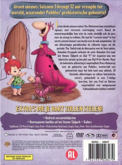 In het derde seizoen zetten The Flintstones hun onstuitbare opmars met rotsvaste overtuiging voort. Naast de onvoorwaardelijke fans wist de reeks eindelijk ook de pers over de streep te trekken. Die had de "cartoon show" in het eerste seizoen immers een beetje met de nek aangekeken. Tal van afleveringen parodieerden de culturele hypes uit die periode: The Twitch stak de dinosaurus met de Twist-gekte, Hawaiian Escapade verkaste de serie Hawaiian Eye naar het Stenen Tijdperk en Dial "S" for Suspicion was een hilarische variant op het plot van Dial M for Murder. Maar de bekendste aflevering is ongetwijfeld Dress Rehearsal, met de geboorte van Pebbles, toentertijd een gebeurtenis waar het hele land naar uitkeek. 28 klassieke afleveringen en talloze fantastische extra's, gebundeld in een 5-delige luxe-box, het zou Fred en Barney ongetwijfeld een welgemeend Yabbadabbadoo hebben ontlokt!