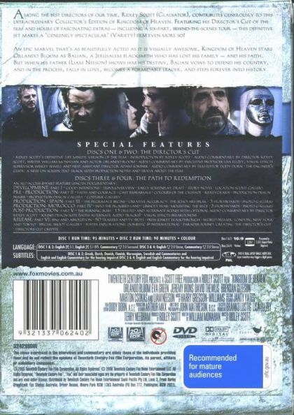 Among the best directors of our time, Ridley Scott (Gladiator), contributes generously to this extraordinary Collector's Edition of Kingdom of Heaven. Featuring his Director's Cut of the film and hours of fascinating extras - including a six-part, behind-the-scenes tour - this definitive set makes a "genuinely spectacular" (Variety) film even more so!An epic marvel that's as beautifully acted as it is visually awesome, Kingdom of Heaven stars Orlando Bloom as Balian, a Jerusalem blacksmith who has lost his family - and his faith. But when his father (Liam Neeson) shows him his destiny, Balian vows to defend his country, and in the process, falls in love, becomes a formidable leader, and steps forever into history.