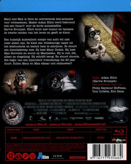 Mary and Max is lieve en ontroerende klei-animatie voor volwassenen. Maker Adam Elliot werd bekroond met een Oscar® voor de korte animatiefilm Harvie Krumpet. Elliot toont met humor en fantasie de zwarte randen van het leven en geeft ze kleur.Een huiselijk Australisch meisje van acht wil niet meer alleen zijn. Ze kiest een willekeurige naam uit het telefoonboek en besluit hem te schrijven. Ze stuurt een chocoladereep mee. Zij heet Mary Dinkle. Hij heet Max Horowitz en woont op Manhattan. Hij is oud, dik, alleen en chagrijnig. Hij schrijft terug. En stuurt chocola. Het begin van een bijzondere vriendschap die 20 jaar duurt. Zullen Mary en Max elkaar ooit ontmoeten?