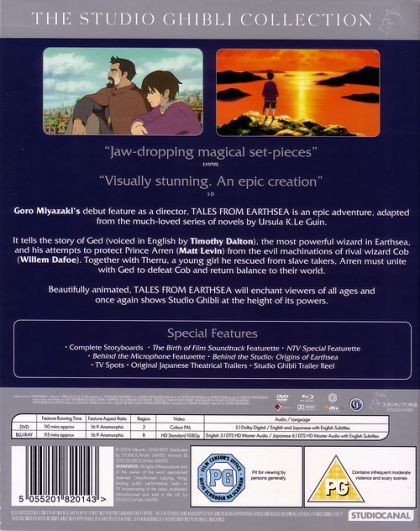 Goro Miyazaki's debut feature as director, Tales From Earthsea is an epic adventure, adapted from the much-loved series of novels by Ursula K. Le Guin.It tells the story of Ged (voiced in English by Timothy Dalton), the most powerful wizard in Earthsea, and his attempts to protect Prince Arren (Matt Levin) from the evil machinations of rival wizard Cob (Willem Dafoe). Together with Therru, a young girl he rescued from slave takers,Arren must unite with Ged to defeat Cob and return balance to their world.Beautifully animated, 'Tales From Earthsea' will enchant viewers of all ages and once again shows Studio Ghibli at the height of its powers.