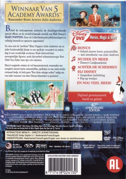 Beleef de buitengewone animatie, de duizelingwekkende special effects, en de award-winnende muziek van Walt Disney's MARY POPPINS. Deze uit 2-disc bestaande jubileumuitgave is volledig hersteld en opnieuw opgenomen!Ga mee met de "perfecte" Mary Poppins (Julie Andrews) als ze ieder huishoudelijke klusje in een spelletje verandert en iedere dag in een wonderlijk avontuur. Raak betoverd door onvergetelijke figuren, zoals bijvoorbeeld schoorsteenveger Bert (Dick Van Dyke) met zijn vele talenten.Mary's magische reistas zit vol bonusmateriaal, waaronder een compleet nieuwe korte animatiefilm, spelletjes en een nooit eerder vertoond liedje. Je hebt geen "Een klein schepje suiker" nodig om van ieder moment van deze Disney-klassieker te genieten!