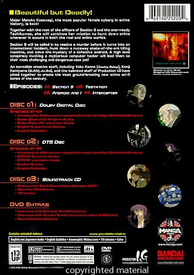 Major Motoko Kusanagi, the most popular female cyborg in anime history, is back! Together with the rest of the officers of Section 9 and the every-ready Tachikomas, she will continue her mission to hunt down crime wherever it occurs in both the real and online worlds. Section 9 will be called in to resolve a murder before it turns into an international incident, hunt down a runaway state-of-the-art killing machine, and solve the mystery of a defective android. A high level conspiracy involving a mysterious computer hacker will lead them to their most challenging and dangerous case yet! An incredible creative staff, including Yoko Kanno ('Cowboy Bebop'), Kenji Kamiyama ('BLOOD', 'Jin-Roh'), and the talented staff of Production I.G have joined together to create the most ground-breaking new anime sci-fi series of the century. Episodes: 01. 'Section 9' 02. 'Testation' 03. 'Android and I' 04. 'Intercepter'DISC 01: DOLBY DIGITAL DISCEpisodes 01 - 04- Anamorphic Widescreen encoded directly from High-Definition Masters- Dolby Digital 5.1 English Audio- Dolby Digital 5.1 Japanexe Audio- English & Japanese Stereo- English SubtitlesDISC 02: DTS DISCEpisodes 01 - 04- Anamorphic Widescreen encoded directly from High-Definition Masters- DTS 5.1 English Audio- DTS 5.1 Japanexe Audio- English Stereo- English SubtitlesDISC 03: SOUNDTRACK CD- 'Ghost in the Shell: Stand Alone Complex OST+- Music by Yoko Kanno- 18 TracksDVD EXTRAS- Interview with Director Kenji Kamiyama- Interview with Atsuko Tanaka (Japanese voice of Motoko)- Special Edition Booklet