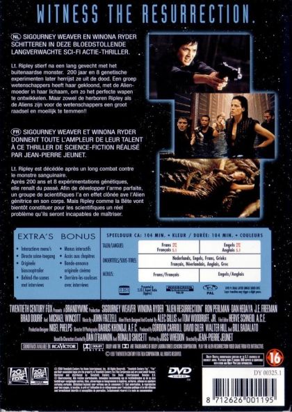 SIGOURNEY WEAVER EN WINONA RYDER SCHITTEREN IN DEZE BLOEDSTOLLENDE LANGVERWACHTE SCI-FI ACTIE-THRILLER.Lt. Ripley stierf na een lang gevecht met het buitenaardse monster. 200 jaar en 8 genetische experimenten later herrijst ze uit de dood. Een groep wetenschappers heeft haar gekloond, met de Alien-moeder in haar lichaam, om zo het perfecte wapen te ontwikkelen. Maar zowel de herboren Ripley als de Aliens zijn voor de wetenschappers een groot raadsel en moeilijk te temmen!!