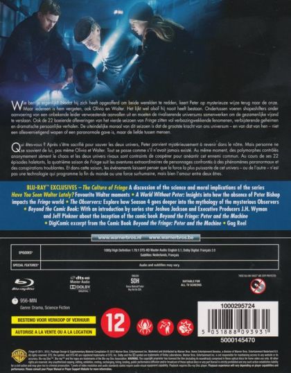 Wie ben je eigenlijk? Nadat hij zich heeft opgeofferd om beide werelden te redden, keert Peter op mysterieuze wijze terug naar de onze. Maar iedereen is hem vergeten, ook Olivia en Walter. Het lijkt wel alsof hij nooit heeft bestaan. Ondertussen voeren shapeshifters onder aanvoering van een onbekende leider verwoestende aanvallen uit en moeten de rivaliserende universums samenwerken om de gezamenlijke vijand te verslaan. Ook de 22 boeiende afleveringen van het vierde seizoen van Fringe zitten vol verbazingwekkende fenomenen, verbijsterende geheimen en dramatische persoonlijke verhalen. De uiteindelijke moraal van dit seizoen is dat de grootste kracht van ons universum – en van dat van hen – niet een allesvernietigend wapen of een paranormale gave is, maar de liefde tussen mensen.Episodes:1: Neither Here Nor There2: One Night in October3: Alone in the World4: Subject 95: Novation6: And Those We've Left Behind7: Wallflower8: Back To Where You've Never Been9: Enemy of My Enemy10: Forced Perspective11: Making Angels12: Welcome To Westfield13: A Better Human Being14: The End of All Things15: A Short Story About Love16: Nothing As It Seems17: Everything In Its Right Place18: The Consultant19: Letters of Transit20: Worlds Apart21: Brave New World: Part 122: Brave New World: Part 2