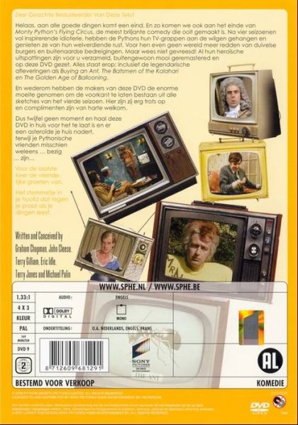 Zeer Geachte Bestudeerder Van Deze Tekst,Helaas, aan alle goede dingen komt een eind. En zo komen we ook aan het einde van 'Monty Python's Flying Circus', de meest briljante comedy die ooit gemaakt is. Na vier seizoenen vol inspirerende idioterie, hebben de Pythons hun TV-grappen aan de wilgen gehangen en genieten ze van hun welverdiende rust. Voor hen even geen wereld meer redden van duivelse burgers en buitenaardse bedreigingen. Maar wees niet bevreesd! Al hun heroïsche uitspattingen zijn voor u verzameld, buitengewoon mooi geremastered en op deze DVD gezet. Alles staat erop: inclusief de legendarische afleveringen als 'Buying An Ant', 'The Batsmen of the Kalahari' en 'The Golden Age of Ballooning'.En wederom hebben de makers van deze DVD de enorme moeite genomen om de voorkant te laten bestaan uit alle sketches van het vierde seizoen. Hier zijn zij erg trots op en complimenten zijn van harte welkom.Dus twijfel geen moment en haal deze DVD in huis voor het te laat is en er een asteroïde je huis nadert, terwijl je Pythonische vrienden misschien weleens ... bezig ... zijn ...Voor de laatste keer de vriendelijke groeten van,Het stemmetje in je hoofd dat tegen je praat als je dingen leest.