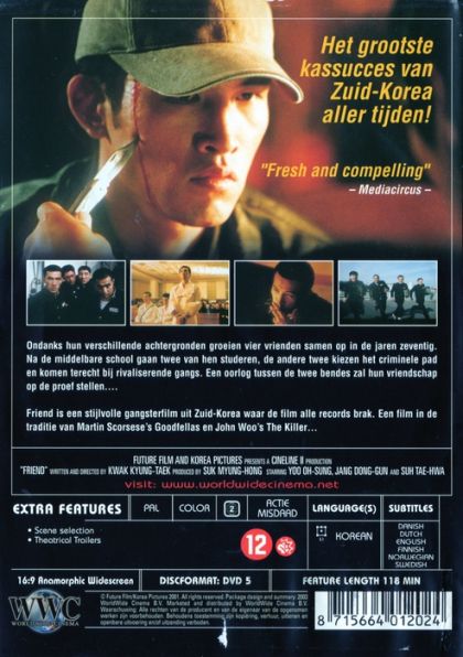 Ondanks hun verschillende achtergronden groeien vier vrienden samen op in de jaren zeventig. Na de middelbare school gaan twee van hen studeren, de andere twee kiezen het criminele pad en komen terecht bij rivaliserende gangs. Een oorlog tussen de twee bendes zal hun vriendschap op de proef stellen...Friend is een stijlvolle gangsterfilm uit Zuid-Korea waar de film alle records brak. Een film in de traditie van Martin Scorsese's Goodfellas en John Woo's The Killer...