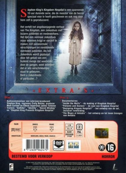 Stephen King's Kingdom Hospital is een spannende 10 uur durende serie, die de meester van de horror speciaal voor tv heeft geschreven en ook nog door hem zelf is geproduceerd.Het vertelt het angstaanjagende verhaal van The Kingdom, een ziekenhuis met bizarre patiënten en medewerkers. Het lijkt een normaal ziekenhuis maar iedereen krijgt er vanzelf te maken met paranormale verschijningen en ronddolende overleden patiënten. Als het ziekenhuis wordt geplaagd door het geluid van een huilend meisje dat weerklinkt door de gangen, weet iedereen dat er iets verschrikkelijks staat te gebeuren... Bent u ziekenfonds of particulier...?Episodes:1. Thy Kingdom Come2. Death's Kingdom3. Goodbye Kiss4. West Side of Midnight5. Hook's Kingdom6. The Young and the Headless7. Black Noise8. Heartless9. Butterfingers10. The Passion of Reverend Jimmy11. Seizure Day12. Shoulda' Stood in Bed13. Finale