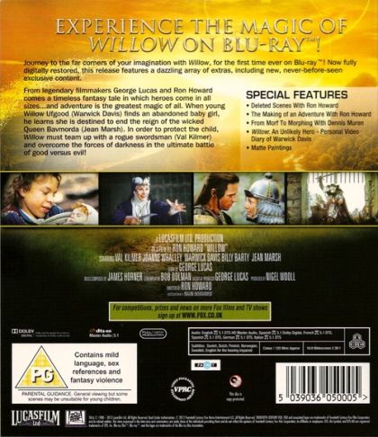 Journey to the far corners of your imagination with Willow, for the first time ever on Blu-ray! Now fully digitally restored, this release features a dazzling array of extras, including new, never-before-seen exclusive content. From legendary filmmakers George Lucas and Ron Howard comes a timeless fantasy tale in which heroes comes in all sizes...and adventure is the greatest magic of all. When young Willow Ufgood (Warwick Davis) finds an abandoned baby girl, he learns she is destined to end the reign of the wicked Queen Bavmorda (Jean Marsh). In order to protect the child, Willow must team up with a rogue swordsman (Val Kilmer) and overcome the forces of darkness in the ultimate battle of good versus evil!