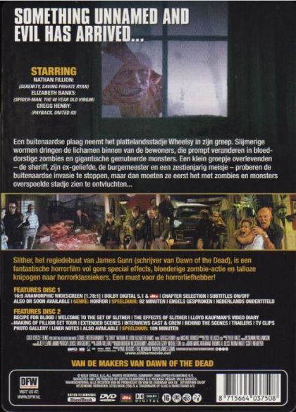 Een buitenaardse plaag neemt het plattelandsstadje Wheelsy in zijn greep. Slijmerige wormen dringen de lichamen binnen van de bewoners, die prompt veranderen in bloeddorstige zombies en gigantische gemuteerde monsters. Een klein groepje overlevenden - de sheriff, zijn ex-geliefde, de burgemeester en een zestienjarig meisje - proberen de buitenaardse invasie te stoppen, maar dan moeten ze eerst het met zombies en monsters overspoelde stadje zien te ontvluchten...Slither, het regiedebuut van James Gunn (schrijver van Dawn Of The Dead), is een fantastische horrorfilm vol gore special effects, bloederige zombie-actie en talloze knipogen naar horrorklassiekers. Een must voor de horrorliefhebber!