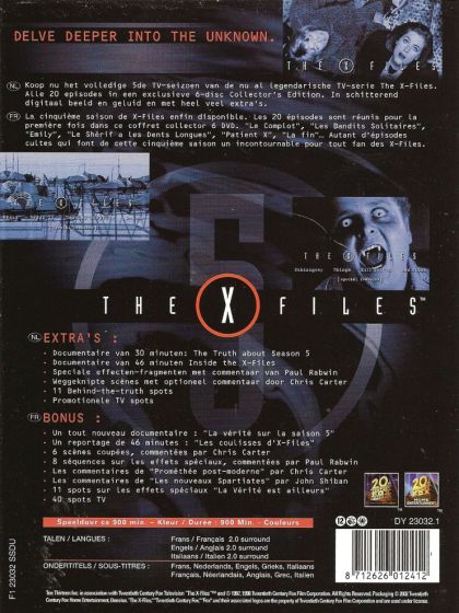 Koop nu het volledige 5de TV-seizoen van de nu al legendarische TV-serie The X-Files. Alle 20 episodes in een exclusieve 6-disc Collector's Edition. In schitterend digitaal beeld en geluid met heel veel extra's.1. Redux2. Redux II3. Unusual Suspects4. Detour5. Post-Modern Prometheus6. Christmas Carol7. Emily8. Kitsunegari9. Schizogeny10. Chinga11. Kill Switch12. Bad Blood13. Patient X14. The Red and the Black15. Travellers16. Mind's Eye17. All Souls18. The Pine Bluff Variant19. Folie à Deux20. The End