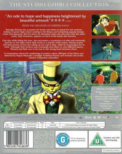 Teenage Shizuku has a passion for books and plans to spend her last summer holiday in junior high school reading in the library and translating popular foreign music into Japanese. But her plans are disrupted when she discovers that the same name, Seiji Amasawa, appears on each of the books she borrows.One day while riding the train, she encounters a mysterious cat who will eventually lead her to the shop where Seiji works as a trainee violin-maker. Shizuku learns that Seiji dreams of one day taking up his craft in Italy, while he encourages her to write. Although their dreams may eventually lead them to very different places, Shizuku and Seiji vow to be true to the strong bond between them. A masterpiece about the awakening of creative talent, Whisper of the Heart was directed by Hayao Miyazaki's protégé Yoshifumi Kondo and remains one of the classics of Japanes animation.