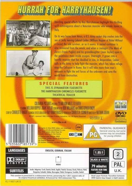 Dazzling special effects by Ray Harryhausen highlight this thrilling sci-fi extravaganza about a Venusian monster who wreaks havoc in Italy.On its way home from Venus, a U.S. Army rocket ship crashes into the sea of Sicily leaving Colonel Calder (William Hopper of Rebel without a Cause) the sole survivor...or so it seems. A sealed container is also recovered from the wreck, and when a zoologist (The Mark of Zorro's Frank Puglia) and his granddaughter (Joan Taylor) open it, the gelatinous mass inside escapes. Overnight, it grows into a horrific monster that has doubled in size. In desperation, Calder calls in the Army to help fight the monster, which has taken refuge atop the Coliseum in Rome. But it will take more than man's weapons to fight the evil forces of the unknown and save the world from destruction.