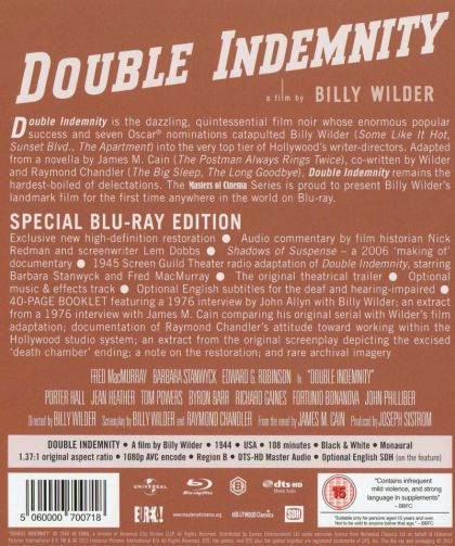 Double Indemnity is the dazzling, quintessential film noir whose enormous popular success and seven Oscar® nominations catapulted Billy Wilder (Some Like It Hot, Sunset Blvd., The Apartment) into the very top tier of Hollywood’s writer-directors. Adapted from a novella by James M. Cain (The Postman Always Rings Twice), co-written by Wilder and Raymond Chandler (The Big Sleep, The Long Goodbye), Double Indemnity remains the hardest-boiled of delectations. The Masters of Cinema Series is proud to present Billy Wilder’s landmark film for the first time anywhere in the world on Blu-ray.
