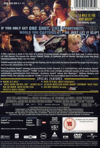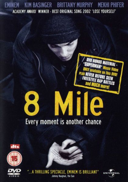 8 Mile explores a week in the lives of a group of young people struggling to find their way in urban decay of 1995 Detroit. For people like Jimmy 'Rabbit' Smith, Jr. (EMINEM) and his friends, hip-hop is the only thing standing between them and the void.Rabbit knows his ticket out is through his rhymes, but to succeed, he has to channel his anger into his lyrics, and face the showdown of his life.From Academy Award® winning producer/director Curtis Hanson† (L.A. CONFIDENTIAL) and Academy Award® winning producer Brian Grazer˜, "8 Mile" is one of the most critically acclaimed movies of the year. Featuring outstanding performances from Eminem+, Academy Award® winner Kim Basinger**, Brittany Murphy and Mekhi Phifer, the crictically acclaimed "8 Mile" is one of the most talked about movies of the year.+ Eminem, 2002, Music (Song), 8 Mile, ('Lose Yourself''; Music by Eminem, Jeff Bass and Luis Resto; Lyric by Eminem).** Kim Basinger, 1997, Best Actress In A Supporting Role, LA Confidential. ˜ Brian Grazer, 2001, Best Picture, A Beautiful Mind (Shared with Ron Howard).† Curtis Hanson, 1997, Best Screenplay Based on Material Previously Produced or Published (Shared with Brian Helgeland), LA Confidential