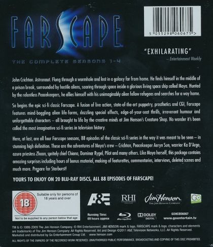 John Crichton. Astronaut. Flung through a wormhole and lost in a galaxy far from home. He finds himself in the middle of a prison break, surrounded by hostile aliens, soaring through space inside a glorious living space ship called Moya. Hunted by the relentless Peacekeepers, he allies himself with his unimaginably alien fellow refugees and searches for a way home.So begins the epic sci fi classic FARSCAPE. A fusion of live action, state-of-the-art puppetry, prosthetics and CGI, FARSCAPE features mind-boggling alien life forms, dazzling special effects, edge-of-your-seat thrills, irreverent humor and unforgettable characters - all brought to life by the creative minds at Jim Henson’s Creature Shop. No wonder it’s been called the most imaginative sci fi series in television history.Here, at last, are all four Farscape seasons, 88 episode of of the classic sci-fi series in the way it was meant to be seen – in stunning high definition. These are the adventures of Moya’s crew – Crichton, Peacekeeper Aeryn Sun, warrior Ka D’Argo, azure priestess Zhaan, spritely chief Chiana, Dominar Rigel, Pilot and many others. Like Moya herself, this package contains amazing surprises including hours of bonus material, making of featurettes, commentaries, interviews, deleted scenes and much more. Prepare for Starburst!
