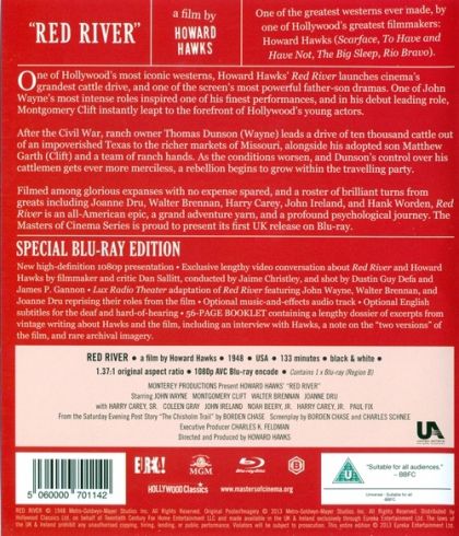 One of Hollywood's most iconic westerns, Howard Hawks's Red River launches cinema's grandest cattle drive, and one of the screen's most powerful father-son dramas. One of John Wayne's most intense roles inspired one of his finest performances, and in his debut leading role, Montgomery Clift instantly leapt to the forefront of Hollywood's young actors.After the Civil War, ranch owner Thomas Dunson (Wayne) leads a drive of ten thousand cattle out of an impoverished Texas to the richer markets of Missouri, alongside his adopted son Matthew Garth (Clift) and a team of ranch hands. As the conditions worsen, and Dunson's control over his cattlemen gets ever more merciless, a rebellion begins to grow within the travelling party.Filmed among glorious expanses with no expense spared, and a roster of brilliant turns from greats including Joanne Dru, Walter Brennan, Harry Carey, John Ireland, and Hank Worden, Red River is an all-American epic, a grand adventure yarn, and a profound psychological journey. The Masters of Cinema Series is proud to present its first UK release on Blu-ray.