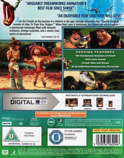 Join the Croods on the journey of a lifetime in the epic comedy-adventure that "has the magical wonder of How To Train Your Dragon." When their cave is destroyed, the Croods set out to explore a spectacular landscape filled with fantastic creatures, strange surprises, and a whole new world of adventure!