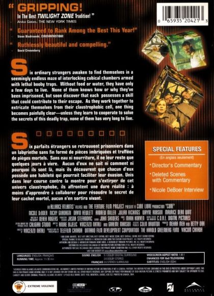 Six ordinary strangers awaken to find themselves in a seemingly endless maze of interlocking cubical chambers armed with lethal booby traps. Without food or water, they have only a few days to live. None of them knows how or why they've been imprisoned, but soon discover that each possesses a skill that could contribute to their escape. As they work together to extricate themselves from their claustrophobic cell, one thing becomes painfully clear : unless they learn to cooperate to solve the secrets of this deadly trap, none of them has very long to live.