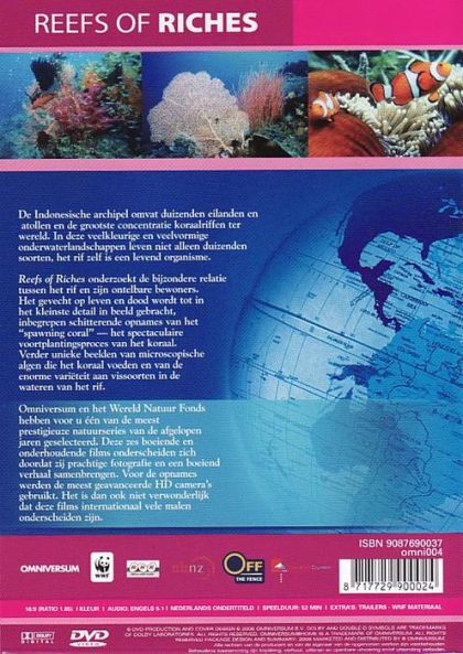 De Indonesische archipel omvat duizenden eilanden en atollen en de grootste concentratie koraalriffen ter wereld. In deze veelkleurige en veelvormige onderwaterlandschappen leven niet alleen duizenden soorten, het rif zelf is een levend organisme.'Reefs of Riches' onderzoekt de bijzondere relatie tussen het rif en zijn ontelbare bewoners. Het gevecht op leven en dood wordt tot in het kleinste detail in beeld gebracht, inbegrepen schitterende opnames van het "spawning coral" - het spectaculaire voortplantingsproces van het koraal. Verder unieke beelden van microscopische algen die het koraal voeden en van de enorme variëteit aan vissoorten in de wateren van het rif.Omniversum en het Wereld Natuur Fonds hebben voor U één van de meest prestigieuze natuurseries van de afgelopen jaren geselecteerd. Deze zes boeiende en onderhoudende films onderscheiden zich doordat zij prachtige fotografie en een boeiend verhaal samenbrengen. Voor de opnames werden de meest geavanceerde HD camera's. Het is dan ook niet verwonderlijk dat deze films internationaal vele malen onderscheiden zijn.