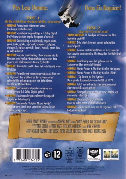 Pies Lesu Domine. Dona Eis Requiem!DISC 1De film, de hele film en niets dan de hele film... en wat extra's:• NIEUW! Fantastische widescreen versie (nu kun je echt alles zien).• NIEUW! Soundtrack in geweldige 5.1 Dolby Digital. De Pythons spreken Engels, Hongaars of Russisch!• NIEUW! Ondertiteling in Nederlands, Engels, Pools, Turks, Grieks, Tsjechisch, Hongaars, Bulgaars, Sloveens, Kroatisch, Russisch, Deens, Zweeds, Noors, Fins en zelfs IJslands!• NIEUW! Speciale ondertiteling - voor mensen die de film niet leuk vinden (ondertiteling geschreven door experts van Shakespeare's Henry IV, deel II).• UNIEK! Filmscript in beeld - lees het script terwijl je de film kijkt.• NIEUW! Verhelderend commentaar tijdens de film van de regisseurs Terry Gilliam en Terry Jones en het gebruikelijke geklaag en gevit van John Cleese, Eric Idle en Michael Palin.• NIEUW! Spectaculaire interactieve menu's met oorverdovend 5.1. Dolby Digital geluid!• NIEUW! Fascinerende scène selecties; bewegend, zingend en belastingvrij!• NIEUW! Spannende 'Follow The Killer Rabbit'-feature. Het konijn verschijnt tijdens de film in beeld, jaag er op!• BIJNA NIEUW! 24 heerlijke seconden extra film, helemaal gratis!!!DISC 2Nog meer extra extra's extra:• NIEUW! Drie hilarische maar vooral belachelijke mee-zingers!• NIEUW! Ga mee met Michael Palin en Terry Jones in hun speciale documentaire: 'The Quest For The Holy Grail Locations'.• NIEUW! Handleiding voor het gebruik van de kokosnoten (een educatief filmpje).• NIEUW! 'Monty Python And The Holy Grail' in het Japans!• NIEUW! 'Monty Python And The Holy Grail' in LEGO!• NIEUW! 'Op locatie bij de Pythons'. De originele documentaire van de BBC uit 1974.• NIEUW! Foto's van achter de schermen, nog nooit door menselijke ogen gezien!• NIEUW! Filmografieën van cast en crew, ontdek wie de meeste rollen had.• NIEUW! Diverse trailers en weblinks (voor de echte nerds, eh filmliefhebbers).• NIEUW! Documentaire over hoe de regisseurs het budget opmaakten!