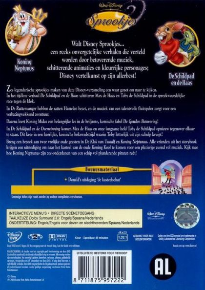Zes legendarische sprookjes maken van deze Disney-verzameling een waar genot om naar te kijken. In het tijdloze verhaald De Schildpad en de Haas schitteren Max Hare en Toby Tortoise in de spreekwoordelijke race tegen de klok.In De Rattenvanger hebben de ratten Hamelen bezet, en de muziek van een talentvolle fluitspeler zorgt voor een verbazingwekkend avontuur.Daarna leert Koning Midas een belangrijke les in de briljante, komische fabel De Gouden Betovering!In De Schildpad en de Overwinning komen Max Hare en onze langzame held Toby Tortoise opnieuw tegenover elkaar te staan. Dit keer in een heerlijke, komische bokswedstrijd waarin Toby letterlijk uit zijn schulp kruipt!Breng een bezoek aan twee vrolijke oude geesten in De Klok van Twaalf en Koning Neptunus. Alle vrienden uit het storybook krijgen een uitnodiging om naar het kasteel van Koning Cole te komen voor een plezierige avond vol muziek. Kijk mee hoe Koning Neptunus zijn zee-onderdanen v an een schip vol plunderende piraten redt!