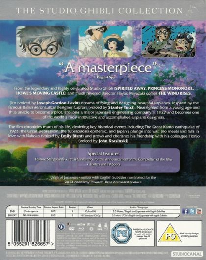 From the legendary and highly celebrated Studio Ghibli (SPIRITED AWAY, PRINCESS MONONOKE, HOWL'S MOVING CASTLE) and much revered director Hayao Miyazaki comes THE WIND RISES.Jiro (voiced by Joseph Gordon-Levitt) dreams of flying and designing beautiful airplanes, inspired by the famous Italian aeronautical designer Caproni (voiced by Stanley Tucci). Nearsighted from a young age and thus unable to become a pilot, Jiro joins a major Japanese engineering company in 1927 and becomes one of the world's most innovative and accomplished airplane designers.The film chronicles much of his life, depicting key historical events including The Great Kanto earthquake of 1923, the Great Depression, the tuberculosis epidemic, and Japan's plunge into war. Jiro meets and falls in love with Nahoko (voiced by Emily Blunt) and grows and cherishes his friendship with his colleague Honjo (voiced by John Krasinski).