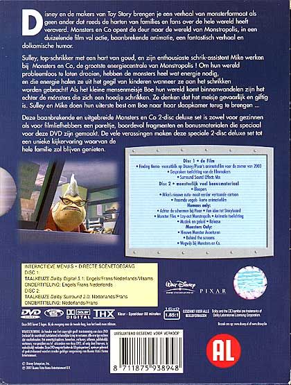 Disney en de makers van Toy Story brengen je een verhaal van monsterformaat als geen ander dat reeds de harten van families en fans over de hele wereld heeft veroverd. Monsters en Co opent de deur naar de wereld van Monstropolis, in een duizelende film vol actie, baanbrekende animatie, een fantastisch verhaal en dolkomische humor.Sulley, top-schrikker met een hart van goud, en zijn enthousiaste schrik-assistent Mike werken bij Monsters en Co, de grootste energiecentrale van Monstropolis! Om hun wereld probleemloos te laten draaien, hebben de monsters heel wat energie nodig, en die energie halen ze uit gegil van kinderen wanneer ze aan het schrikken worden gebracht! Als het kleine mensenmeisje Boe hun wereld komt binnenwandelen zijn het echter de mónsters die zich een hoedje schrikken. Ze denken dat het meisje gevaarlijk en giftig is. Sulley en Mike doen hun uiterste best om Boe naar haar slaapkamer terug te brengen...Deze baanbrekende en uitgebreide Monsters en Co 2-disc deluxe set is zowel voor gezinnen als voor filmliefhebbers een pareltje, boordevol fragmenten en bonusmaterialen die speciaal voor deze DVD zijn gemaakt. De vele verrassingen maken deze speciale 2-disc deluxe set tot een unieke kijkervaring waarvan de hele familie zal blijven genieten.