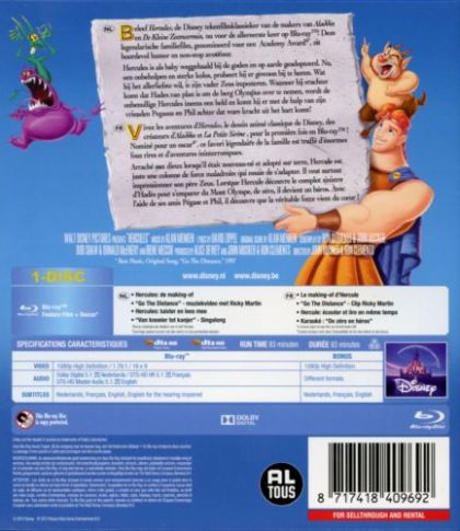 Beleef Hercules, de Disney tekenfilmklassieker van de makers van Aladdin en De Kleine Zeemeermin, nu voor de allereerste keer op Blu-ray™! Deze legendarische familiefilm, genomineerd voor een Academy Award®, zit boordevol humor en non-stop avontuur.Hercules is als baby weggehaald bij de goden en op aarde geadopteerd. Nu, een onbeholpen en sterke kolos, probeert hij er gewoon bij te horen. Wat hij het allerliefste wil, is zijn vader Zeus imponeren. Wanneer hij erachter komt dat Hades van plan is om de berg Olympus over te nemen, wordt de onbenullige Hercules ineens een held en komt hij er met de hulp van zijn vrienden Pegasus en Phil achter dat ware kracht uit het hart komt!