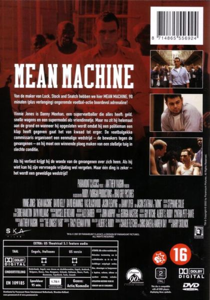 Van de maker van Lock, Stock and Snatch hebben we hier MEAN MACHINE, 90 minuten (plus verlenging) ongeremde voetbal-actie boordevol adrenaline!Vinnie Jones is Danny Meehan, een supervoetballer die alles heeft: geld, snelle wagens en een supermodel als vriendinnetje. Maar nu zit hij helemaal aan de grond en wanneer hij opgesloten wordt omdat hij een politieman een klap heeft gegeven gaat het van kwaad tot erger. De voetbalgekke commissaris organiseert een eenmalige wedstrijd - de bewakers tegen de gevangenen - en hij moet een winnende ploeg maken van een stelletje tuig in slechte conditie.Als hij verliest krijgt hij de woede van de gevangenen over zich heen. Als hij wint kan hij zijn vervroegde vrijlating wel vergeten. Maar een ding is zeker - het wordt een geweldige wedstrijd!