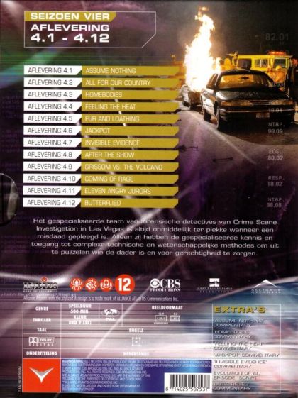 Het gespecialiseerde team van forensische detectives van Crime Scene Investigation in Las Vegas is altijd onmiddellijk ter plekke wanneer een misdaad gepleegd is. Alleen zij hebben de gespecialiseerde kennis en toegang tot complexe technische en wetenschappelijke methodes om uit te puzzelen wie de dader is en voor gerechtigheid te zorgen.CSI - Seizoen 4.1DISC 14.01 Assume Nothing4.02 All for Our Country4.03 Homebodies4.04 Feeling the HeatDISC 24.05 Fur and Loathing4.06 Jackpot4.07 Invisible Evidence4.08 After the ShowDISC 34.09 Grissom Versus the Volcano4.10 Coming of Rage4.11 Eleven Angry Jurors4.12 Butterflied