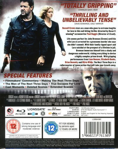 Russell Crowe stars as a man who goes to extreme lengths for love in this nail-biting thriller directed by Oscar® winning* screenwriter Paul Haggis (Director of Crash).Life seems perfect for John Brennan (Crowe) until his wife Lara is arrested for a gruesome murder she says she didn't commit. With their family ripped apart and Lara suicidal at the prospect of a lifetime in jail, Brennan immerses himself into a shady and dangerous underworld, risking everything to devise a highly complex prison break. With gripping performances from Liam Neeson, Elizabeth Banks, Brian Denehy and Olivia Wilde, The NExt Three Days is a rollercoaster of tense action that will take your breath away.*Winner, 2006 - Best Writing, Original Screenplay, for Crash