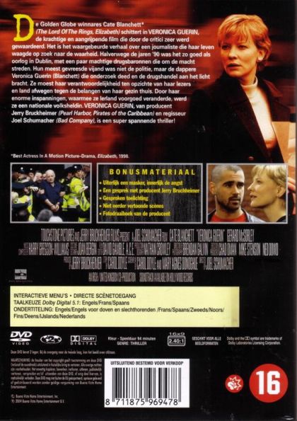 De Golden Globe winnares Cate Blanchett (The Lord of the Rings, Elizabeth) schittert in VERONICA GUERIN, de krachtige en aangrijpende film die door de critici zeer werd gewaardeerd. Het is het waargebeurde verhaal over een journaliste die haar leven waagde op zoek naar de waarheid. Halverwege de jaren '90 was het zo goed als oorlog in Dublin, met een paar machtige drugsbaronnen die om de macht streden. Hun meest gevreesde vijand was niet de politie, maar de dappere Veronica Guerin (Blanchett) die onderzoek deed en de drugshandel aan het licht bracht. Ze moest haar verantwoordelijkheid ten opzichte van haar lezers en land afwegen tegen de belangen van haar gezin thuis. Door haar enorme inspanningen, waarmee ze Ierland voorgoed veranderde, werd ze een nationale volksheldin. VERONICA GUERIN, van producent Jerry Bruckheimer (Pearl Harbour, Pirates of the Carribbean) en regisseur Joel Schumacher (Bad Company), is een super spannende thriller!