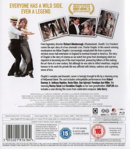 From legendary director Richard Attenborough (Shadowlands, Gandhi, Cry Freedom) comes the epic story of a true cinematic icon, Charlie Chaplin. In this award-winning masterpiece we follow Chaplin's increasingly complicated life from a poverty stricken music hall entertainer in England to eventual triumph in America. The story of Chaplin is the story of cinema as we watch him grow from developing silent era slapstick to becoming one of the most important, pioneering fathers of film making, the art-form of a new century. But although he was able to reflect wondrous, magical humour in his work his private life was afflicted with infamy, sadness and a growing sense of loss.Chaplin's complex and dramatic career is lovingly brought to life by a stunning array of Hollywood talent. The cast includes unforgettable performances from Robert Downey Jr, Anthony Hopkins, Kevin Kline, Dan Aykroyd, Penelope Ann Miller, the stunning Marisa Tomei and Geraldine Chaplin as her own grandmother. CHAPLIN also includes a soul stirring film score from celebrated composer John Barry.