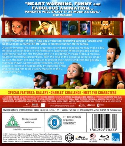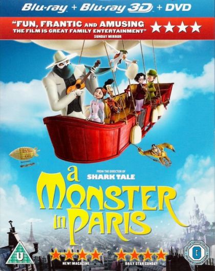 From the Director of Shark Tale and a voice cast featuring Vanessa Paradis and Sean Lennon, A MONSTER IN PARIS is fantastic fun for all the family.A wacky inventor, his camera-crazy best friend and a madcap monkey make a BIG mistake when let loose in the Professor's laboratory! With lotions and potions spilling everywhere, the troublesome trio accidentally create Franc, a musical talent of monstrous proportions. With the help of the beautiful but feisty singer Lucille, the team are on a mission to protect their new friend from the ghastly wannabe Mayor, Commissioner Maynott, who has a plan to increase his popularity by capturing Franc and revealing him to be a scary monster to the people of Paris.