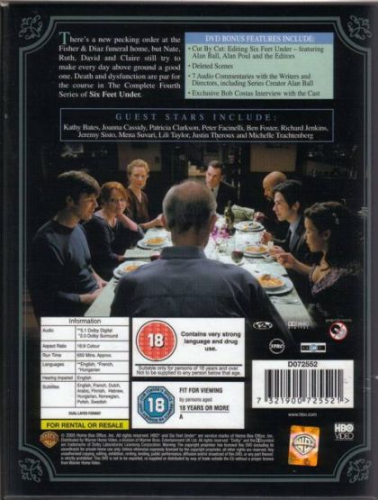 There's a new pecking order at the Fisher & Diaz funeral home, but Nate, Ruth, David and Claire still try to make every day above ground a good one. Death and dysfunction are par for the course in The Complete Fourth Season of Six Feet Under.Episodes comprise:1. Falling Into Place2. In Case Of Rapture3. Parallel Play4. Can I Come Up Now5. That's My Dog6. Terror Starts At Home7. The Dare8. Coming And Going9. Grinding The Corn10. The Black Forest11. The Bomb Shelter12. Untitled