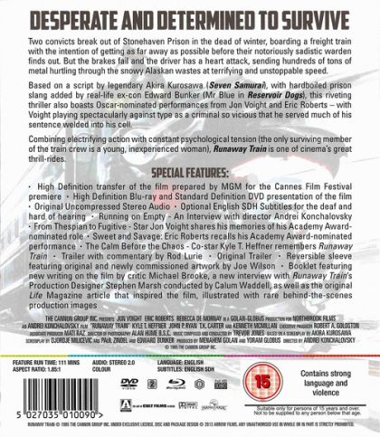 Two convicts break out of Stonehaven Prison in the dead of winter, boarding a freight train with the intention of getting as far away as possible before their notoriously sadistic warden finds out. But the brakes fail and the driver has a heart attack, sending hundreds of tons of metal hurtling through the snowy Alaskan wastes at terrifying and unstoppable speed.Based on a script by legendary Akira Kurosawa (Seven Samurai), with hard-boiled prison slang added by real-life ex-con Edward Bunker (Mr Blue in Reservoir Dogs), this riveting thriller also boasts Oscar-nominated performances from John Voight and Eric Roberts – with Voight playing spectacularly against type as a criminal so vicious that he served most of his sentence welded into his cell.Combining electrifying action with constant psychological tension (the only surviving member of the train crew is a young, inexperienced woman), Runaway Train is one of cinemas great thrill-rides.