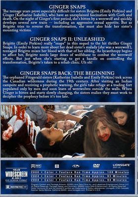 GINGER SNAPS IGinger (16 jr) en Brigitte (14 jr) zijn 2 zusters en alles behalve normale tieners. Ze zijn gefascineerd door de dood, hebben een hekel aan alles en iedereen, worden door hun omgeving met de nek aangekeken en... hebben nog nooit gemenstrueerd! Dit alles verandert wanneer Ginger op een nacht door een wild beest wordt aangerand. Langzamerhand voltrekt zich een ware transformatie: ze begint jongens te verleiden, ze wordt seksueel actief en bovendien ondergaat haar lichaam vreemde veranderingen... ze begint wolfachtige kenmerken te vertonen! Brigitte ziet het gevaar van de 'nieuwe' Ginger en probeert haar zusje te redden voordat Ginger doordraait... GINGER SNAPS IIIn dit vervolg op een van de meest fascinerende horrorfilms van de laatste jaren, zien we hoe Brigitte, de zus van Ginger, slachtoffer wordt van hetzelfde virus dat haar zus in een weerwolf deed veranderen. Geplaagd door visioenen van de overleden Ginger, probeert Brigitte haar lichaamlijke veranderingen tegen te houden. Ze gebruikt daarvoor een drug, die haar gaandeweg verslaafd maakt. Terwijl ze een junkieleven leidt, wordt ze gestalkt door een mannelijke weerwolf, die met haar wil paren. Nadat hij haar bruut heeft aangerand, wordt Brigitte wakker in een afkickkliniek. Gevangen zonder drugs, voelt Brigitte de weerwolf in haar ontwaken. Het duurt niet lang of de eerste doden vallen...GINGER SNAPS IIICanada, 1815. De zussen Ginger en Brigitte zijn overlevenden van een schipbreuk. Tijdens hun tocht door het barre winterse landschap vinden ze onderdak in een fort, dat bewoond wordt door handelaars en ontdekkingsreizigers. Ginger en Brigitte denken dat ze veilig zijn maar als het fort 's nachts wordt aangevallen door een troep hongerige weerwolven, zitten ze als ratten in de val. In het fort lopen de spanningen op tot het kookpunt. De meiden zullen zichzelf in het bos moeten zien te redden, omringd door bloeddorstige monsters, in het bos...GINGER SNAPS BONUSDISC* The Ginger Snaps phenomenon explained* The Wherewolf Saga* Liner Notes & Trivia* Interviews with cast and crew* Photo Gallery