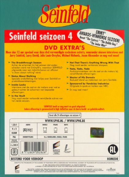 "The Contest", "The Bubble Boy", "The Junior Mint"... Je blijft lachen met één van de grappigste en succesvolste komedieseries allertijden! Alle 24 originele afleveringen van het vierde seizoen van SEINFELD zijn volledig geremasterd in high definition voor de beste beeld- en geluidskwaliteit. Ook deze box met het complete vierde seizoen bevat meer dan 12 uur aan extra's die speciaal voor deze DVD zijn gemaakt.1. The Trip (Part 1)2. The Trip (Part 2)3. The Pitch4. The Ticket5. The Wallet6. The Watch7. The Bubble Boy8. The Cheever Letters9. The Opera10. The Virgin11. The Contest12. The Airport13. The Pick14. The Visa15. The Movie16. The Outing17. The Shoes18. The Old Man19. The Implant20. The Handicap Spot21. The Junior Mint22. The Smelly Car23. The Pilot (1)24. The Pilot (2)