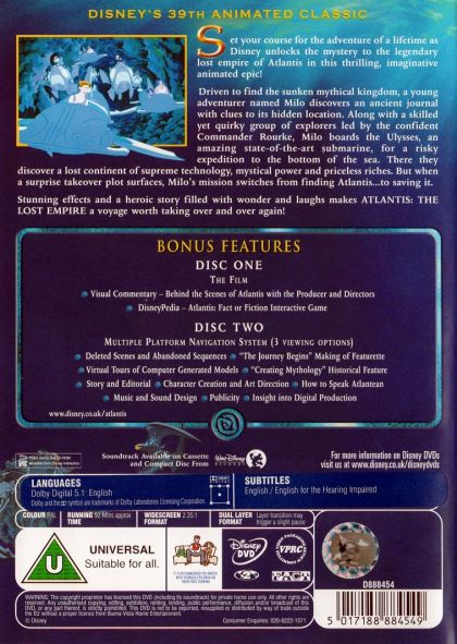 DISNEY'S 39th ANIMATED CLASSICSet your course for the adventure of a lifetime as Disney unlocks the mystery of the legendary lost empire of Atlantis in this thrilling, imaginative animated epic!Driven to find the sunken mythical kingdom, a young adventurer named Milo discovers an ancient journal with clues to its hidden location. Along with a skilled yet quirky group of explorers led by the confident Commander Rourke, Milo boards the Ulysses, an amazing state-of-the-art submarine, for a risky expedition to the bottom of the sea. There, they discover a lost continent of supreme technology, mystical power and priceless riches. But when a surprise takeover plot surfaces, Milo's mission switches from finding Atlantis...to saving it.Stunning effects and a heroic story filled with wonder and laughs makes ATLANTIS: THE LOST EMPIRE a voyage worth taking over and over again!