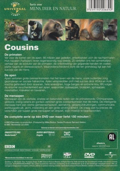 De Primaten: Ver voor de komst van de apen, 66 miljoen jaar geleden, ontwikkelden zich de nachtprimaten. Hun nazaten (halfapen) leven tegenwoordig nog steeds. Zij vertellen ons het opmerkelijke verhaal van de evolutie van de primaten: de ontwikkeling van grijpende handen en voeten, platte nagels en stereoscopisch, kleuronderscheidend zicht die ten grondslag ligt aan het succes van de mens.De Apen: Apen vertonen grote overeenkomsten met het leven van de mens, zoals ouderlijke zorg, gezinsleven en sociale hiërarchie. Apen verspreidden zich met succes door Afrika en Azië, slechts gehinderd door oceanen, hete woestijnen, hoge bergen en extreme kou. Wij volgen de enorme verscheidenheid aan apen, waaronder zijdeaapjes, brulapen, spinaapjes, meerkatten, makaken en bavianen.De Mensapen: Mensapen zijn de sterkste, snelste en bekendste leden van de primatenorde. Chimpansees, gibbons, orang-oetans en gorilla's vertonen grote overeenkomsten met de mens. De intelligente mensaap kent een sterke gemeenschapszin, aanraking, gelaatsuitdrukkingen, communicatie, werktuiggebruik, jacht, misleiding en een grote vindingrijkheid. De vraag wat nu precies de verschillen zijn tussen grote mensapen en onszelf, blijkt moeilijk te beantwoorden.